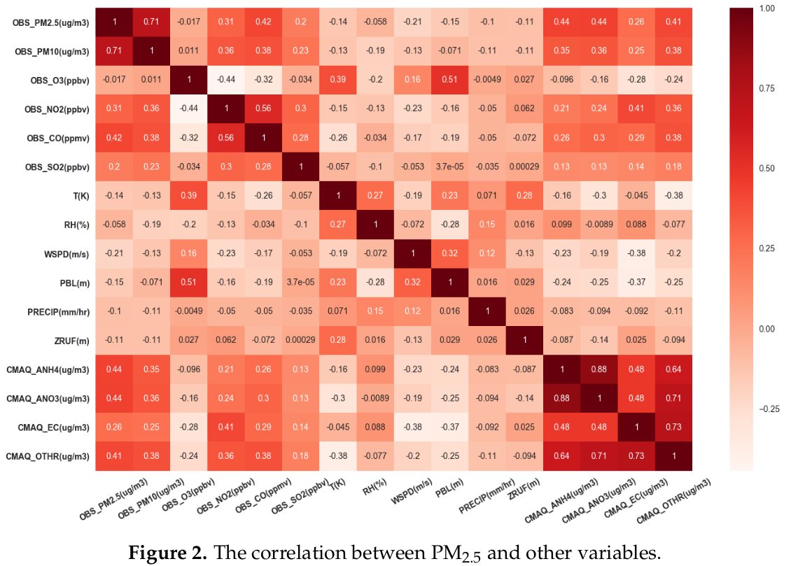 - 예측값: 4개 오염원에 대해 CMAQ로 예측한 것. elemental carbon, nitrate, and ammonium은 PM2.5와 큰 상관관계를 갖는데 이에 대한 관측 데이터가 없음.