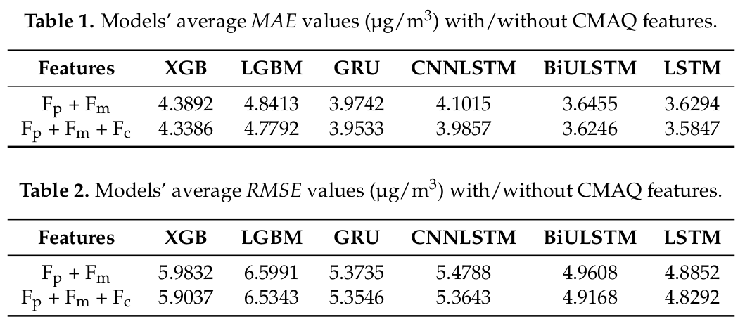 - 오염 농도 변수는 각 지점에서 측정될 수 있고, CMAQ 모델로 예측할 수 있다. CMAQ 모델로 예측한 변수(elemental carbon, 암모니움, 질산염, 기타 미세 오염 물질 농도)를 합쳐서 적용했을 때, 모델의 성능 향상됨.